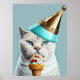 Elevate your wall decor with this humourous and playful wall art collage featuring a blue ice cream king cat wearing a big shiny gold cone on his head. This unique and eye-catching print is perfect for any cat lover who appreciates a touch of whimsy in their home decor.