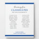 This charming blue school reunion memorial standing plaque sign is a beautiful way to remember those classmates who have passed, but will always be remembered, by listing all their names and displaying at the class reunion.