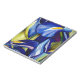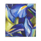 with original designs from original watercolour artwork of detailed, bright blue iris flowers on green background by Sacha Grossel. This detailed botanical inspired art design shows a close focus, macro floral design in cool colours of blue, green with yellow highlights.