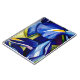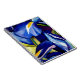 A beautiful notebook for original and inspirational ideas with original designs from original watercolour artwork of detailed, bright blue iris flowers on green background by Sacha Grossel. This detailed botanical inspired art design shows a close focus, macro floral design in cool colours of blue, green with yellow highlights.