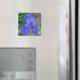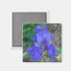 A close up photograph of a beautiful blue iris flower printed on a square fridge magnet.