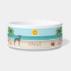 Destei's original cartoon illustration of a cute blue colour Italian Greyhound / Iggy breed dog standing in a tropical summer beach scene. On the beige colour sand there is a palm tree, a pink seashell together with a starfish and a red crab. The water is turquoise blue with some waves and the sun is shining above the horizon. There is also a personalizable text area for a name.