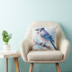 This throw pillow features a watercolor painting of a vibrant blue jay perched on a branch lightly dusted with snow. The bird's striking plumage includes shades of blue, soft lavender, and white. The background blends subtle splashes of blue, creating a dynamic yet serene atmosphere. Perfect for bird lovers!