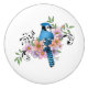 A blue jay bird surrounded by pink, purple and peach pastel coloured spring flowers set against a light blue backdrop.