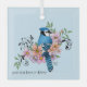 A blue jay bird surrounded by pink, purple and peach pastel coloured spring flowers set against a light blue backdrop.