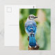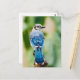 This postcard features a photo of a blue jay, with a beautiful look at its feathers along its back.