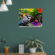 This colourful poster features a blue jay who has landed on a porch deck surrounded by flowers. The blue, grey, white and black coloration of the bird is set off by a riot of colour. There is a decorative teapot with orange and yellow nasturtiums and a purple petunia. Green leaves complete this kaleidoscope of colours.