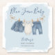 Blue jean baby shower theme featuring baby outfit including: jacket, jeans and baby romper on a pastel blue background. A minimalist modern baby shower theme for gender neutral baby celebrations. You can easily personalise this with your details.