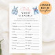 Challenge guests with this Baby Shower Word Scramble game card. Featuring a cute watercolor clothesline with denim and pink baby clothes, this game invites guests to unscramble baby-related words. The first to finish wins a prize! A fun and classic activity that fits beautifully with your denim blue jean baby shower theme.