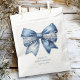 Introducing adorable favour bags for a delightful baby shower that embodies the essence of country charm! This enchanting design showcases a whimsical blue jean print coquette bow, adorned with exquisite pearl and lace detailing that adds a touch of elegance. The beautiful contrast against the soft white background creates a striking visual appeal.