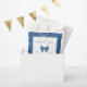 This delightful baby girl shower Thank You favour bag design offers a fresh take on traditional themes. The clever use of a blue jean texture as a backdrop, complete with the visual detail of white stitching, instantly establishes a playful yet stylish vibe. The focal point is the square "patch" motif, outlined with more stitching and the phrase "Thank You". It is adorned with an adorable denim coquette bow, adding a sweet and homespun touch.