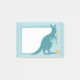 Blue kangaroo knitting needles ball of yarn post-it notes
