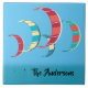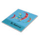 Blue Kite surfing themed decorative ceramic tile with customisable text. Colourful kitesurfers' kites fly over the summer ocean.