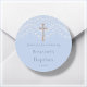 Beautiful Baptism thank you favor stickers, featuring a gold crucifix and pretty lace effect on blue. Ready for easy personalization.