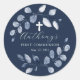 Beautiful hand painted watercolor design featuring a soft blue leaf wreath and cross.