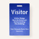 Vertical Visitor's Pass badge in blue leather gradient design. All elements are changable or removable. Elements include: Visitor (can say "guest" or "pass" or any word, the phrase "Visitor Badge Must Be Returned Before Exiting the Building, company name, company department, Security barcode scan is on the back and can be changed or removed. Slot at top for lanyard, but you can choose another option, such as a metal clip or retractable strap.