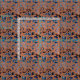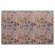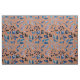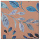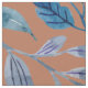 Watercolor leaves in shades of blue on rust/burnt orange fabric.