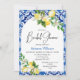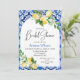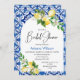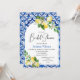 Modern blue and white tile and lemons bridal shower invitation also featuring an off white arch with a light blue border and a modern calligraphy heading image. This