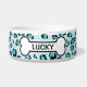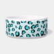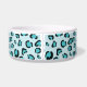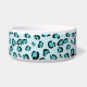 This blue pet bowl has a digitally created leopard print pattern with a dog bow that has a customisable text area inside of it for pet's name.