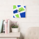 Wall clock printed with original geometric series acrylic painting in blue, lime green and white.