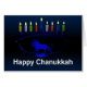 A blue, lion-themed Chanukkah menorah with lit candles. Add your own text.