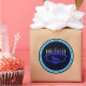 A blue, lion-themed Chanukkah menorah with lit candles on a starry background.