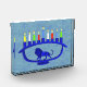 Features a blue, lion-themed Chanukkah menorah with all eight candles and the shamash burning. Chanukkah is the mid-winter "Festival of Lights."