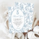 Elegant preppy little bunny themed baby boy shower thank you card showcasing cute blue toile pattern with bunnies, spring flowers and butterflies. Perfect for spring Easter classic styled baby celebration.