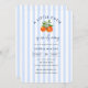 Cute modern preppy baby blue and white stripe background "a little cutie is on its way" Citrus themed baby shower invitation.