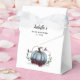Little pumpkin theme baby shower favour box featuring illustration of a blue pumpkin with faux silver glitter, burgundy red flowers, and green foliage. Perfect for a boy's shower in the fall.