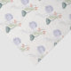 A light print designed with small nodding blue lotus pods, powder blue hydrangea, coral berries and a fern like leaf. This print is over a background image of faux-parchment for dressiness.