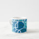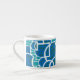 A stylish Espresso Coffee Mug with a turquoise, deep blue, sea green and white abstract pattern, from a silkscreen print by Judy Adamson.