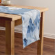 A table runner in dark blue, white and light blue marble liquid ink colours. The design is a dreamy romantic and elegant design with gold and silver traces like the coastal sea breeze shimmers. It looks like an abstract marmor stone texture and fluid lava at the same time interrupted by dusty blue stripes. This design fits perfect in coastal homes and makes the breeze come into your room.