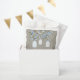 Burlap and mason jar baby shower gift bags with pretty blue mason jars and blue cherry blossom branch on a rustic burlap background. Personalise these rustic burlap mason jar favour bags with the text of your choice.