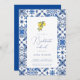 This elegant invitation features intricate blue tile patterns reminiscent of the captivating landscapes of the Mediterranean coast. Infused with the refreshing spirit of citrus, delicate illustrations of lemons and oranges grace the invitation, creating a touch of zestful celebration.