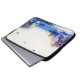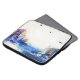 Waterfront watercolor art titled "Misty Morning" on a great laptop sleeve from MHamilton Art features a sailboat heading out with buildings in the background. Colours are blue and tan on white. Watery nautical abstract design. Customise it.