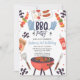 BBQ birthday party invitation featuring a red Bbq, sauce bottle, blue oven mitts, coal, kebabs, sausages and more in the colorful backyard bbq birthday invitation design.