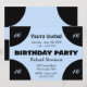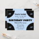Light blue centre on black birthday party invite. Blue and black gives this a modern look. Add the age or leave it blank - Complete with RSVP
