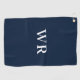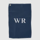 Blue modern monogram initial golf towel. Simple design with two initials on navy blue background. Makes a great gift idea for the golfer.