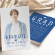 Modern and minimal typography graduation announcements with photo, fun graduation party invitation on the back in blue and white, Custom it with your own photo and party information.