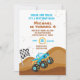 Blue Monster Truck 4th Birthday Racing Invitations. Invite has a monster truck on a hill of dirt with a black and white chequered flag. Customise with your party details.
