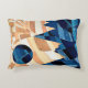 Accent pillow with bold complementary colours and interesting shapes and textures; an abstract artwork depicting a blue moon and mountains against a fiery orange sky.