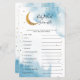 Cute over the moon theme baby shower baby word scramble card featuring watercolor splash in blue with faux gold moon and stars. The list of words on this card are all related to babies and they are scrambled. The guests are going to compete who can unscramble all of them first! ANSWER KEY: 1. car seat 2. milk 3. playpen 4. pacifier 5. diaper 6. rocking chair 7. nursery 8. baby monitor 9. swaddle 10. formula 11. rubber ducky 12. stroller.