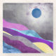 A beautiful abstract landscape design with a blue moon and colourful textured rolling hills in shades of purple, violet, blue, cyan, and yellow.