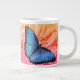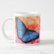 Decorative nature mug in blue and pink colours. Butterfly Blue Morpho against a background of succulents. Summer style for rest and relaxation in nature right at your home. Perfect for a gift for coworkers, friends, or family.