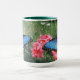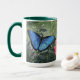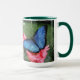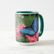 Decorative mug in blue, pink and green colours. Beautiful Butterflies Blue Morpho against the background of blooming roses near the water. So cosy for your home, or as a gift! Summer style for rest and relaxation in nature right at your home.