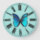 An exotic Blue Morpho butterfly centres on this classic clock face with a complimentary pale blue background.