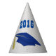 Graduation party hat, with graphics of a white textured background, with a blue and gold graduates mortarboard cap, on the front. Bold blue numbers, on the front, indicate the graduation year, personalise this year to suit your graduation party needs.