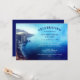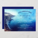 Life celebration invitation in shades of blue with a watercolor wash meeting a photo of a craggy beach. Ocean themed funeral invitation personalised with your loved one's name and years living. Blue watercolor memorial invitation with blue and white text and without a photo.