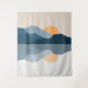 Abstract colourful illustration of sunrise with blue mountains reflected in the lake